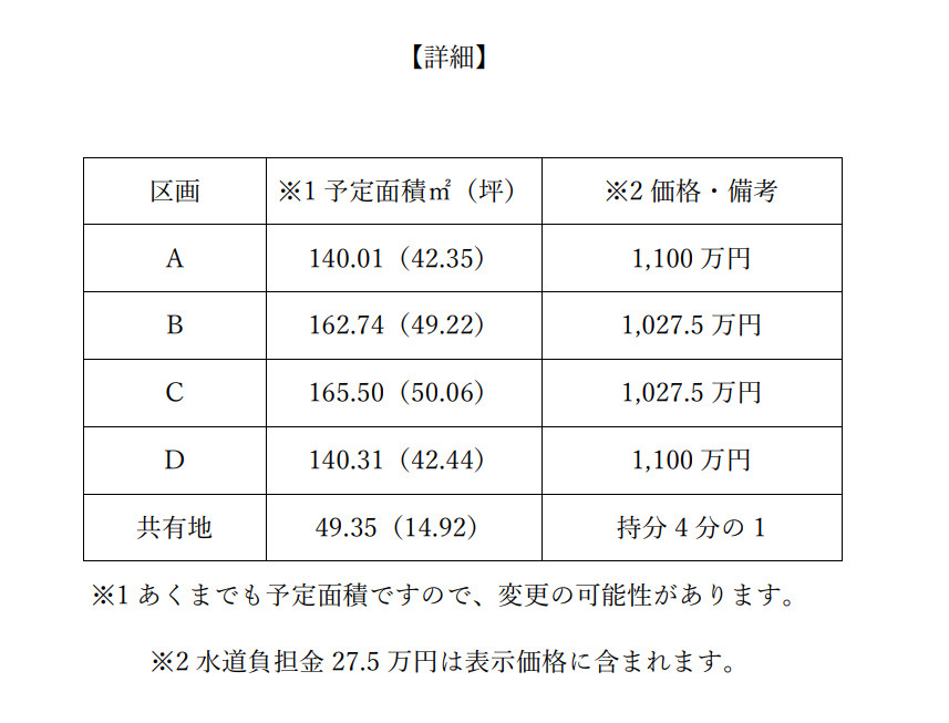 | 価格 | 1,027.5万円 ~ 1,100万円 | 坪単価 | 20.53万円 ~ 25.97万円 |